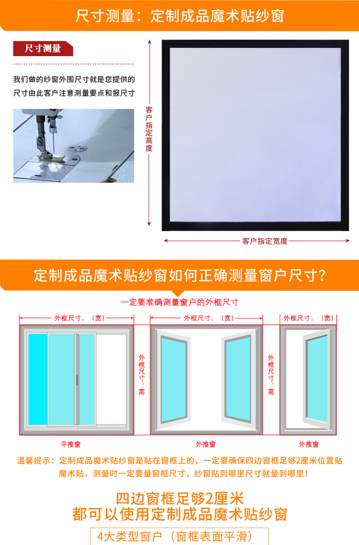 防霧霾魔術(shù)貼紗窗四邊窗框需要有2厘米左右的空檔防霧霾魔術(shù)貼紗窗適用四大類(lèi)型的窗戶(hù):