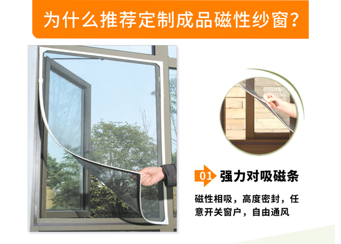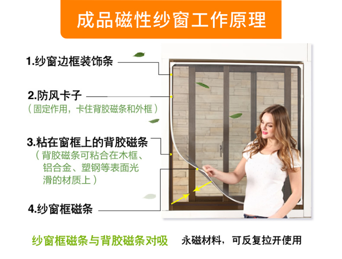 防霧霾紗窗磁性防霧霾紗窗不破壞窗框,直接粘貼到窗框上磁性防霧霾紗窗不破壞窗框,直接將窗紗粘貼到窗框上磁性防霧霾紗窗是單面背膠磁條與紗窗磁條對(duì)吸磁性防霧霾紗窗是單面背膠磁條與紗窗磁條對(duì)吸,可以反復(fù)拉開(kāi)和吸附。磁性防霧霾紗窗框顏色有四種可選磁性防霧霾紗窗框顏色有四種可選,白色、灰色、綠色、咖啡色。