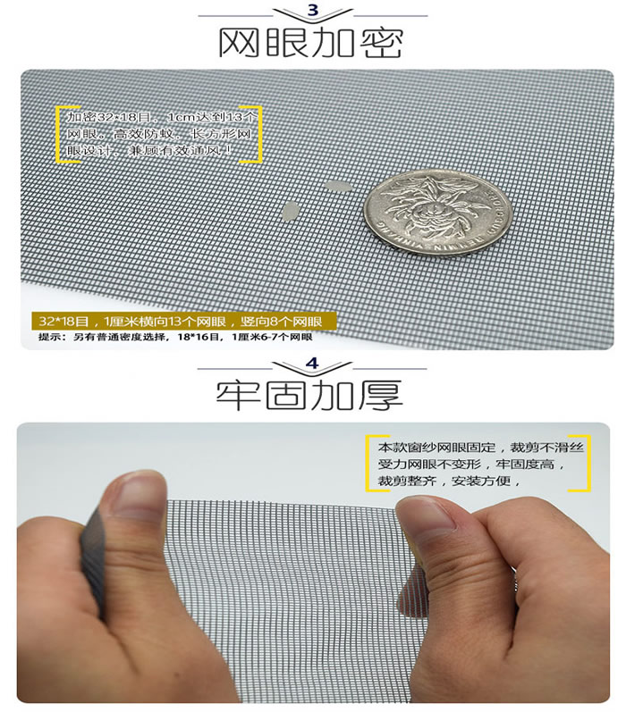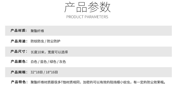 聚酯纖維的優(yōu)點(diǎn)是具有抗皺性和保形性,耐熱和耐光性好,而且有很高的拉伸強(qiáng)度,保型性好就是說(shuō)他的彈性恢復(fù)能力很好。其牢固耐用、抗皺免燙、不粘毛。32目紗網(wǎng)較18目紗網(wǎng)網(wǎng)眼更加密實(shí),具有一定的防塵性能。