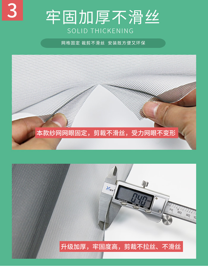 聚酯纖維紗窗網(wǎng)的材質(zhì)和許多T恤材質(zhì)相同,無(wú)毒無(wú)味,透視度高,而且耐高溫,耐陽(yáng)光直射,壽命可達(dá)4-5年,加密的紗窗還具有防塵效果。